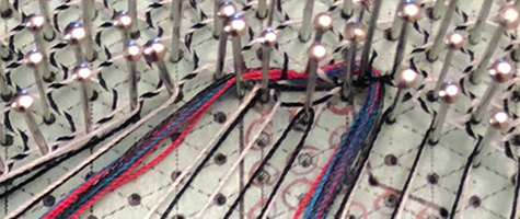 The background will be made with white thread. Inside of the logo will have an alternate twist, so the black thread will show. I am using a gimp (thicker thread) made up of blue and pink strands, like the colors in the logo. Since the entire piece only uses one stitch, it should work up pretty quickly. So far, the tulle stitch looks as it should.