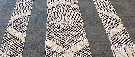 I thought the picture below helps to show the scale of the lace. Saying it is about 20 feet long is very different from seeing it compared to the size of an adult. The center panel is 2 foot wide and the outer panels are each 1 foot wide. I am proud of my plastic grocery bag lace, and relieved that it is finished.